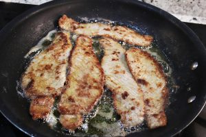 - Add all of the scallopini in a single layer, do not crowd and sauté for 3-4 minutes per side. Move the pan around a couple of times to cook evenly. When the first side is nicely browned, flip each piece and sauté the second side for another 3/4 minutes.