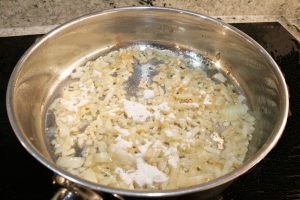 - Sprinkle onions with 1 tablespoon of flour remaining from dredging rabbit pieces and stir until well incorporated, then cook for a minute or so, until mixture starts to smell toasty.