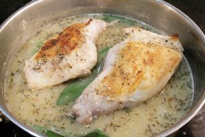 - Return browned rabbit pieces to the sauce. Add 2 sprigs thyme and 6 whole sage leaves. Cover pan, reduce heat to medium low and cook for 45 minutes to an hour, or until meat is fork tender.